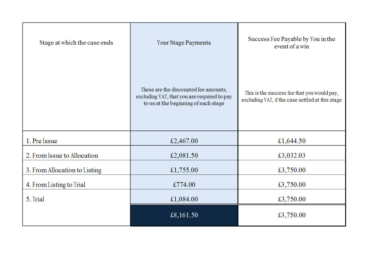 - A modest success fee payable by you if you win. You can even see what the maximum success fee will be at each stage the litigation might settle (the earlier the settlement, the smaller the success fee, as we will have done less work)